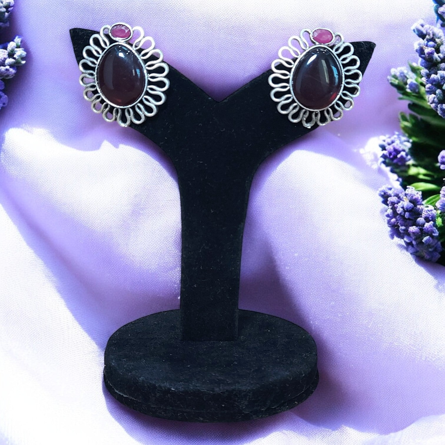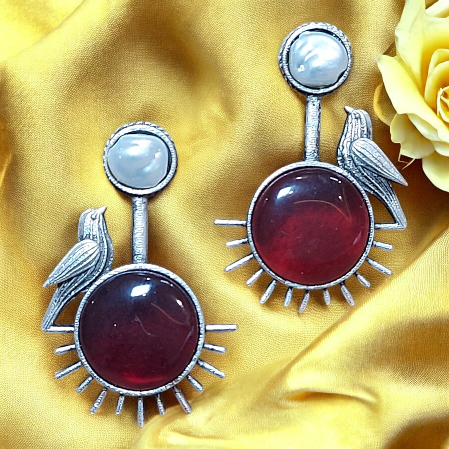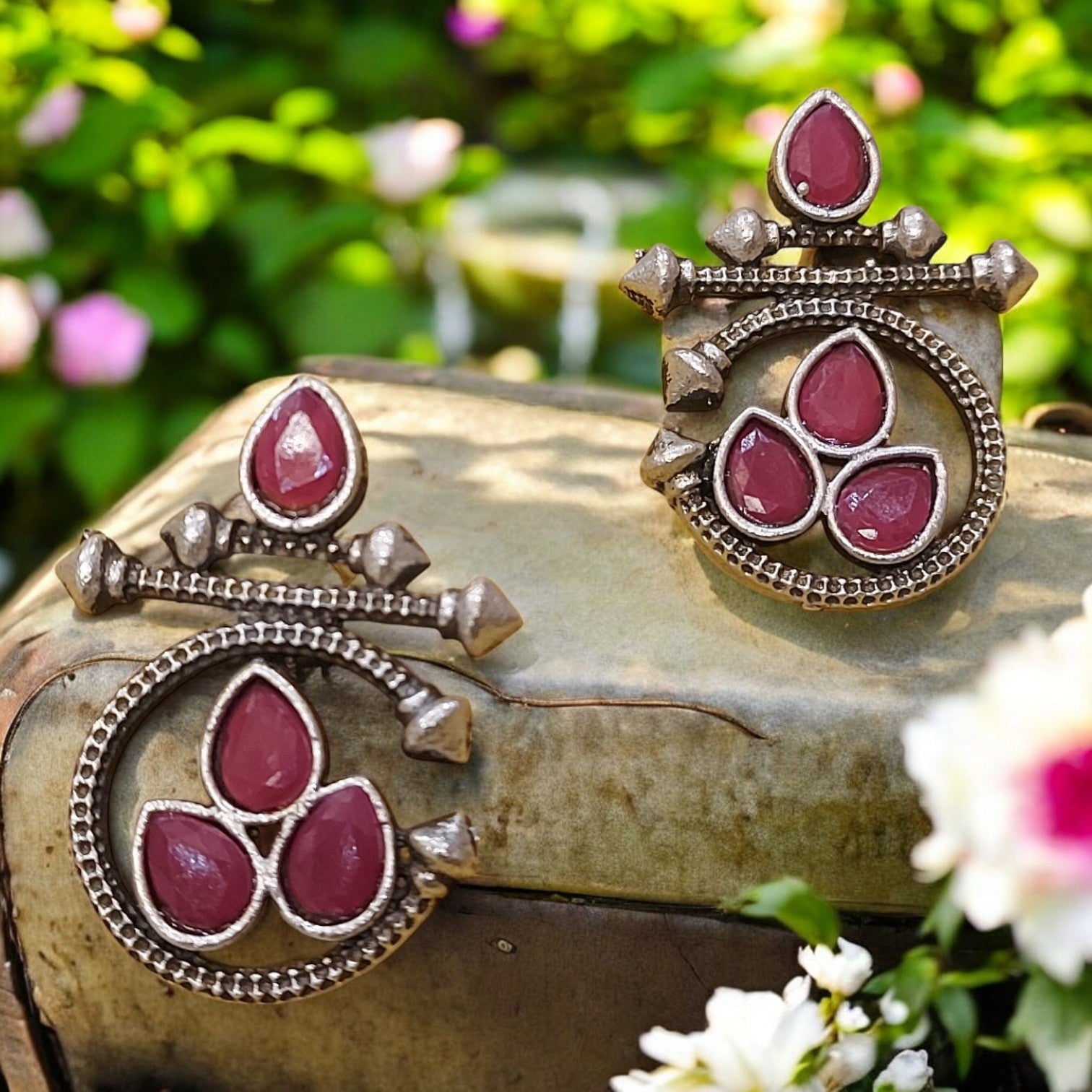 Oxidised silver Monalisa ruby red stone royal stud earrings showcase a blend of vintage appeal and modern elegance. The oxidised...
