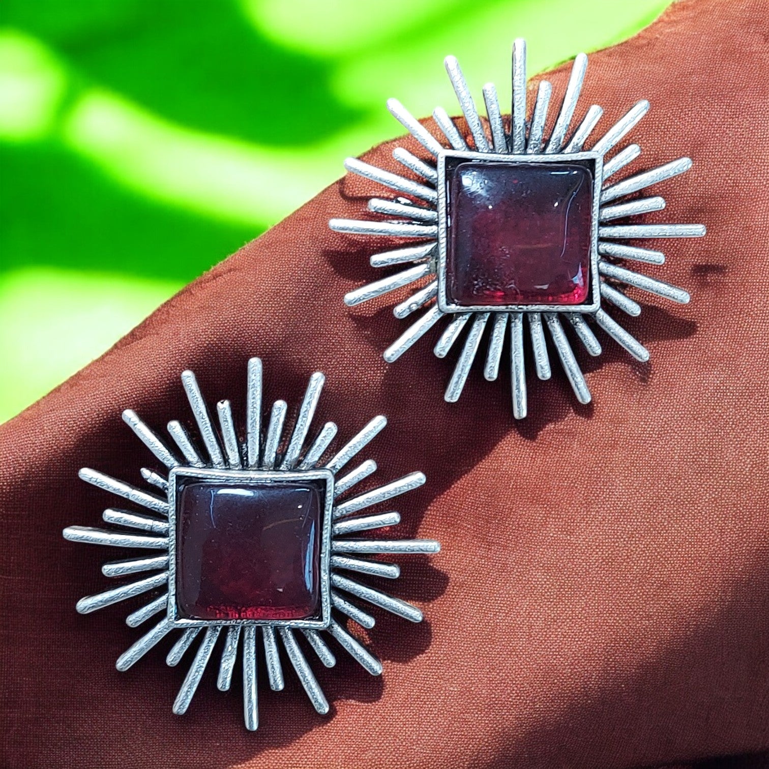 MONALISA STONE SUN RAYS ANTIQUE SILVER EARRINGS-RUBY