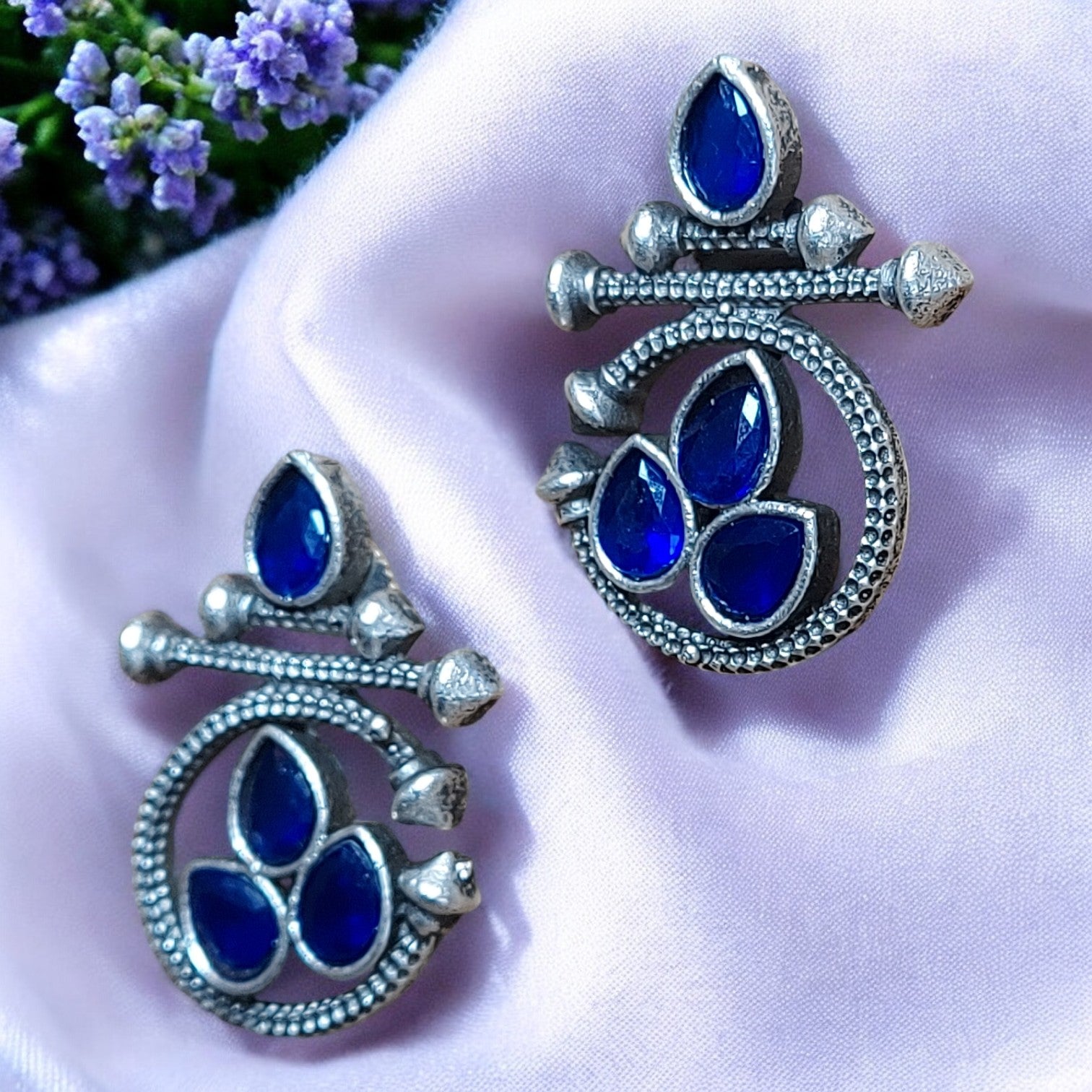 Oxidized silver earrings featuring blue semi-precious stones offer a striking and artistic look. The oxidized finish gives the silver a...