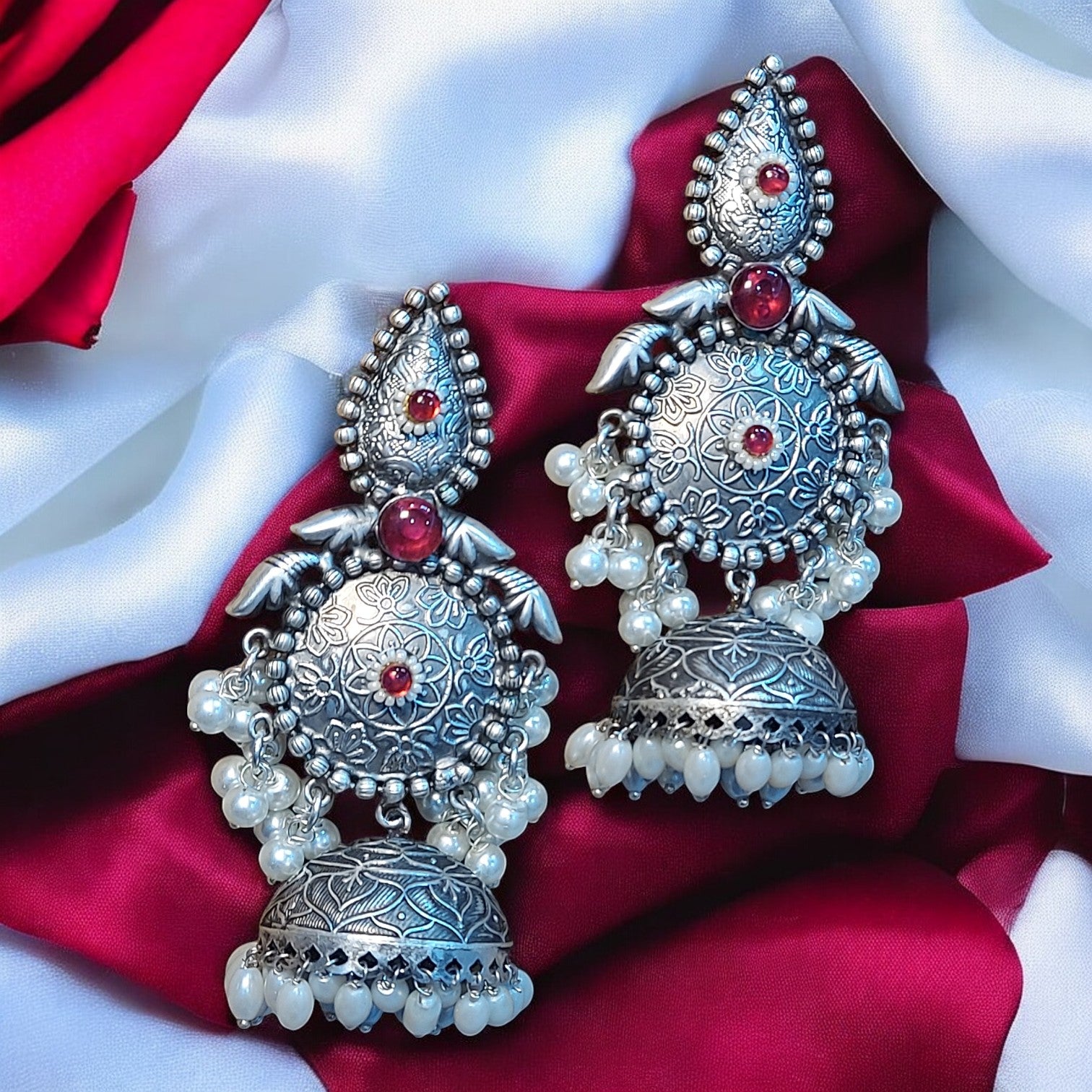 Silver oxidized long jhumka earrings with pearl hangings with ruby stones feature a beautiful blend of traditional and contemporary styles....