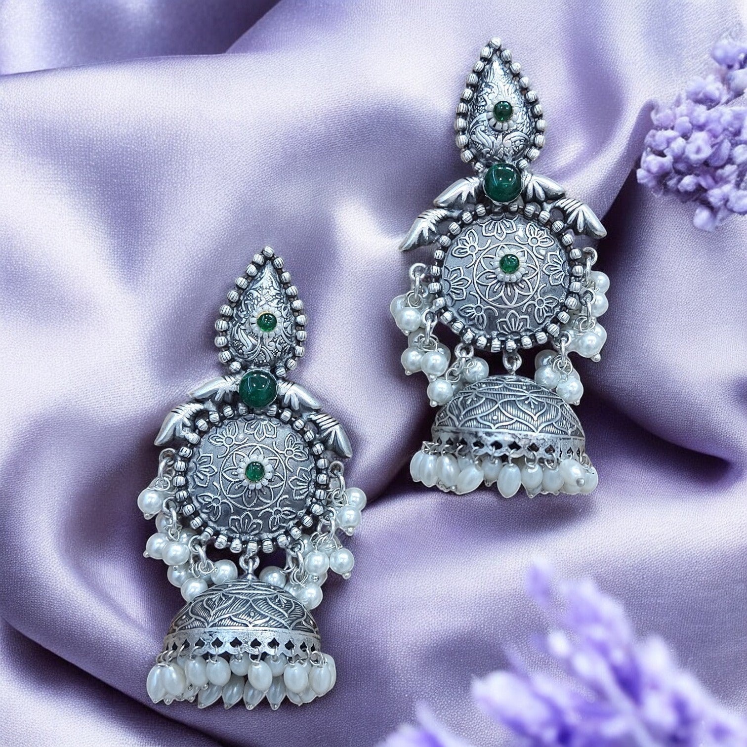 Silver oxidized long jhumka earrings with pearl hangings with green stones feature a beautiful blend of traditional and contemporary styles....