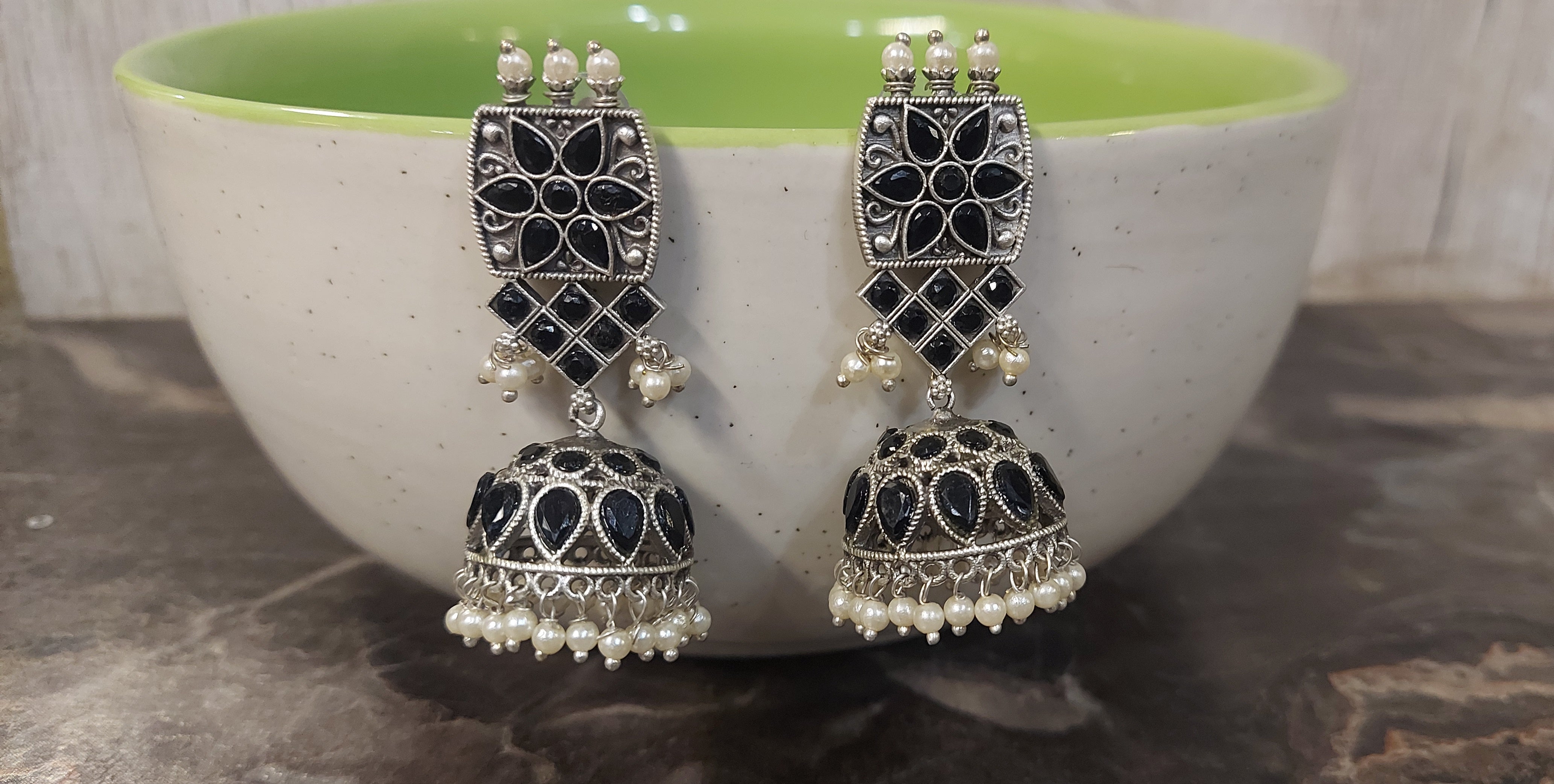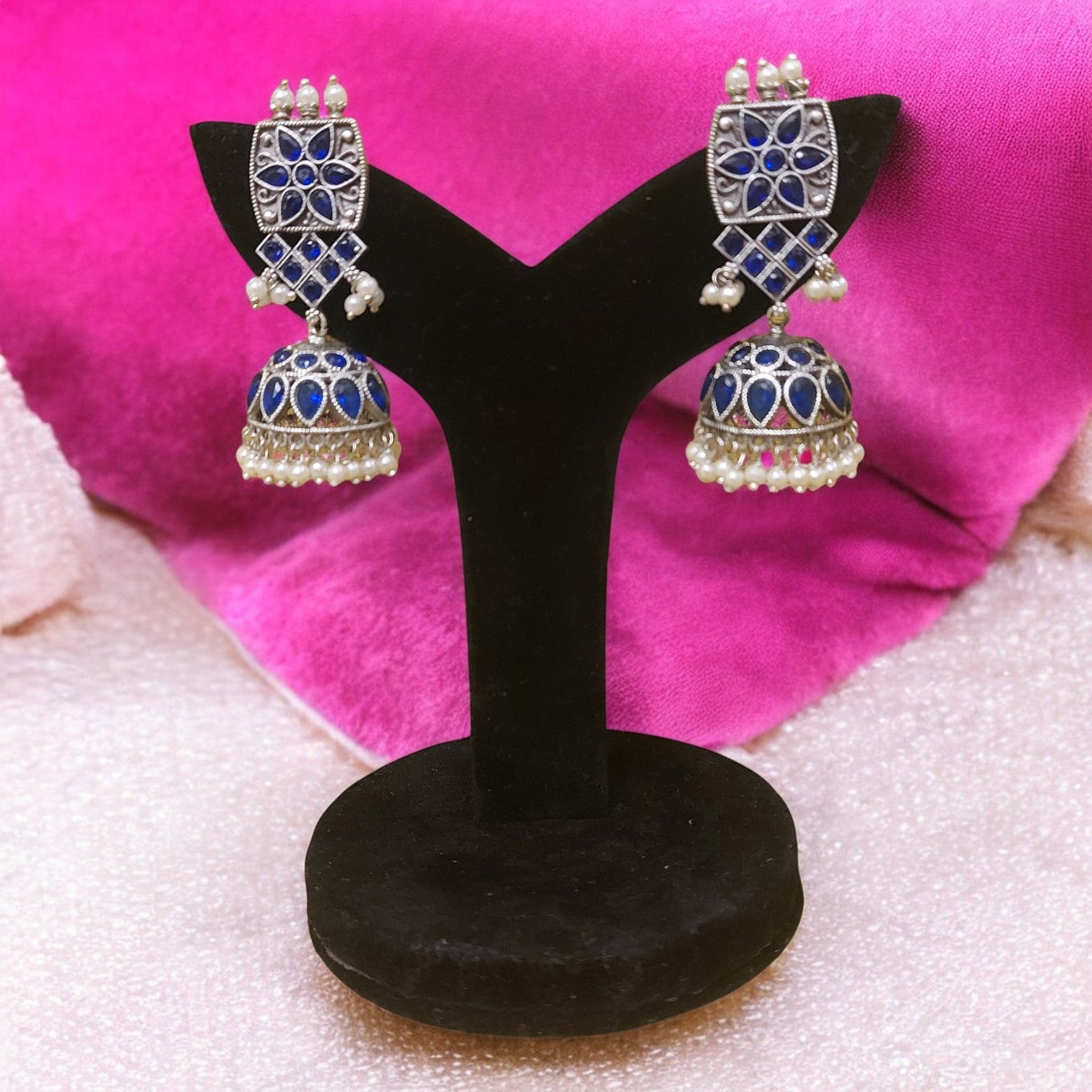 SILVER OXIDIZED BLUE SEMI-PRECIOUS NANDI JHUMKAS