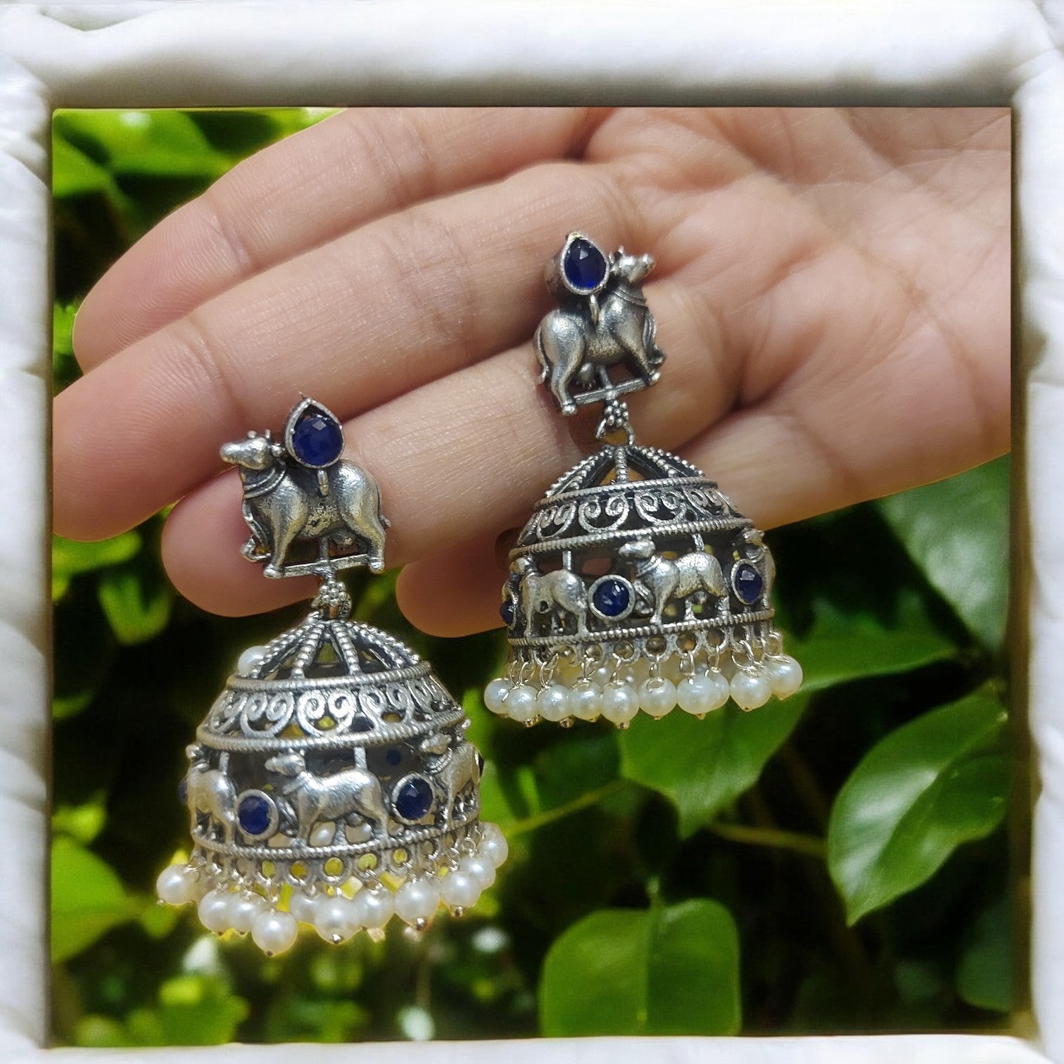 Silver oxidized blue semi-precious stone Nandi jhumkas feature a unique design inspired by the sacred Nandi bull, symbolizing strength and...