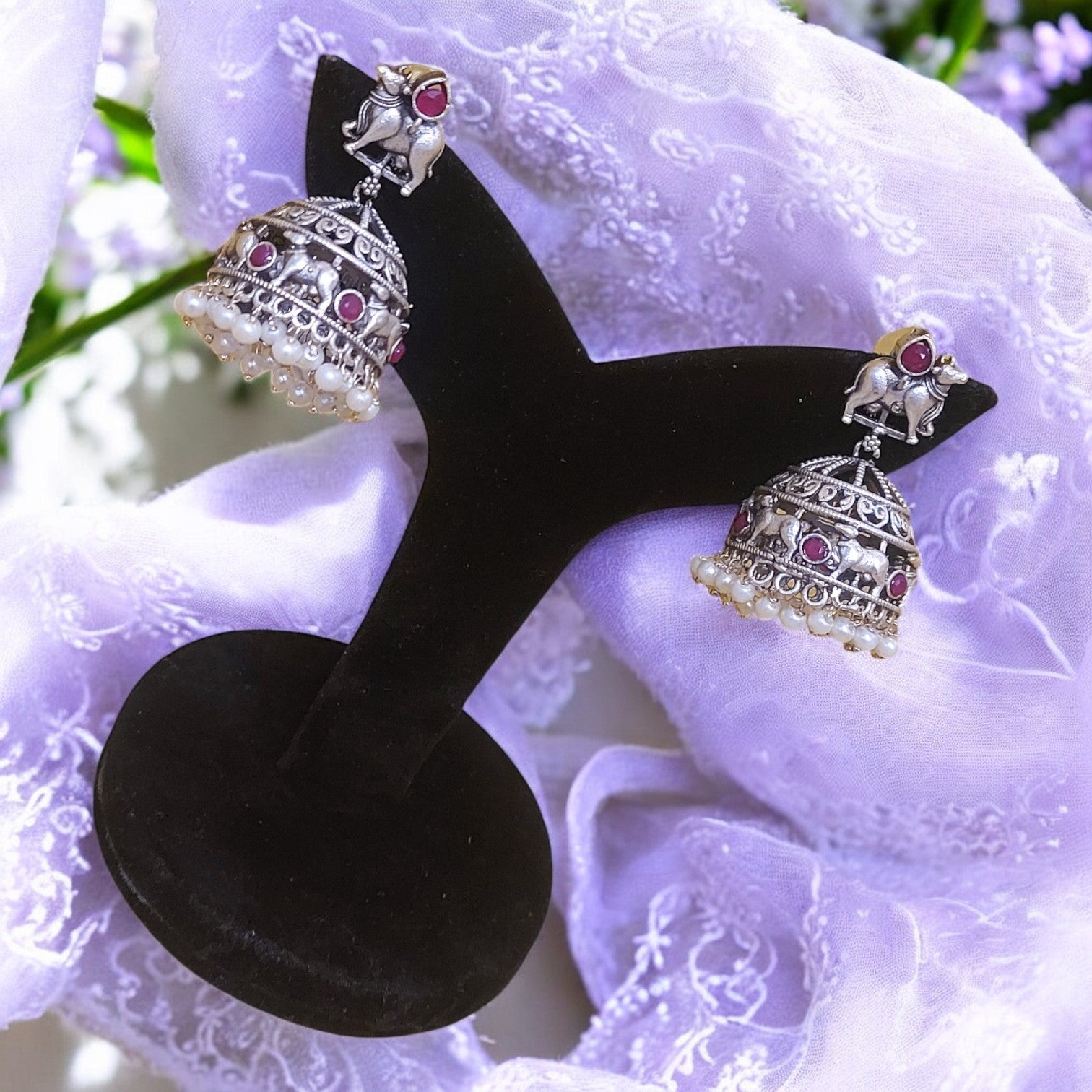 Silver oxidized ruby semi-precious stone Nandi jhumkas feature a unique design inspired by the sacred Nandi bull, symbolizing strength and...