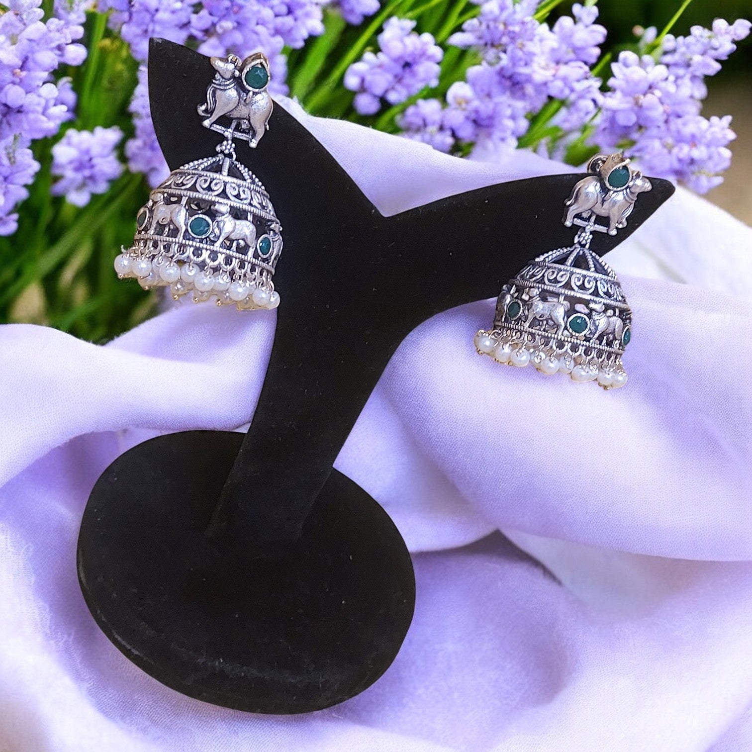 Silver oxidized green semi-precious stone Nandi jhumkas feature a unique design inspired by the sacred Nandi bull, symbolizing strength and...