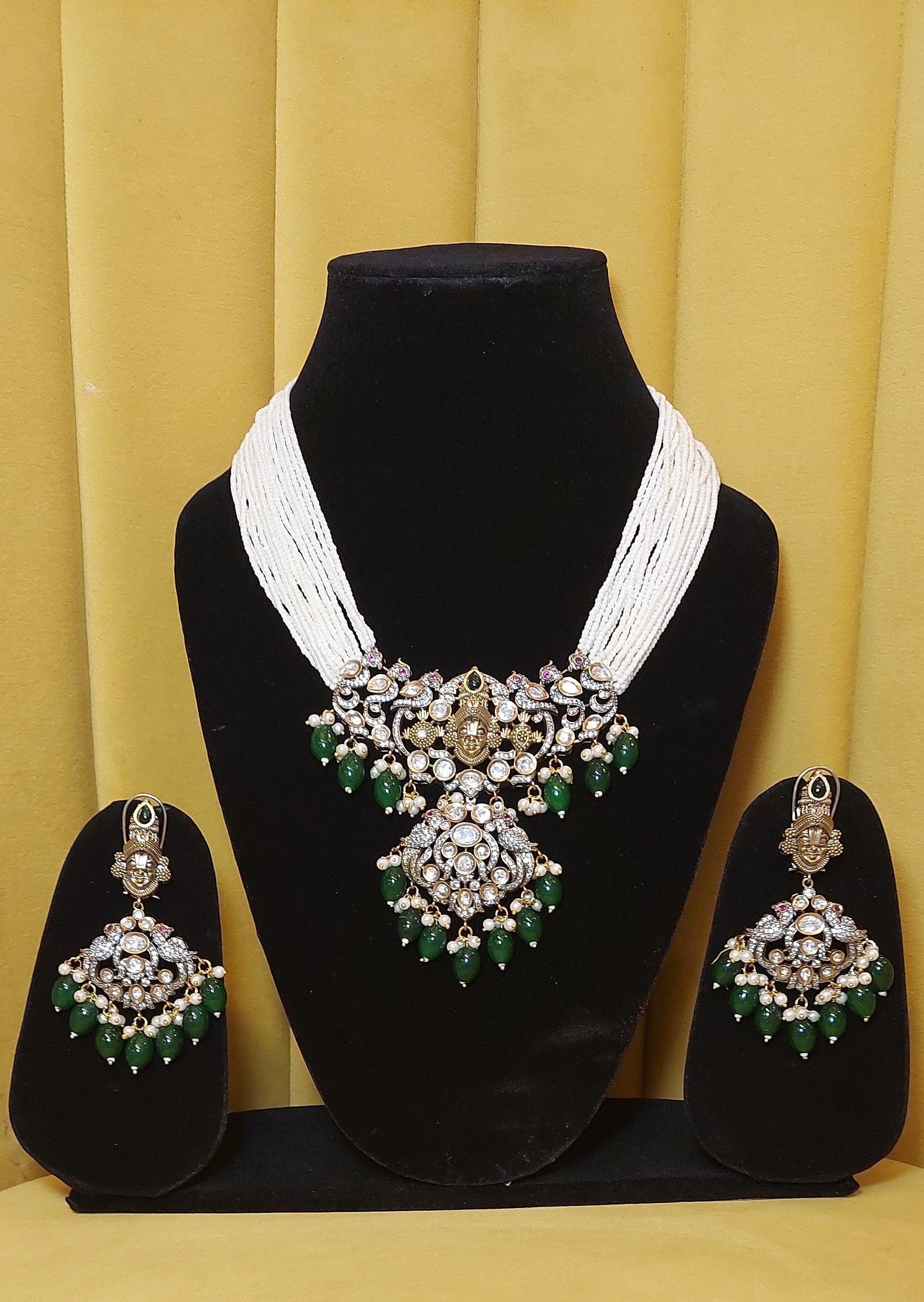 This Victorian Tirupati polki kundan jewelry set showcases a blend of traditional and vintage aesthetics. Crafted with intricate detailing, the...