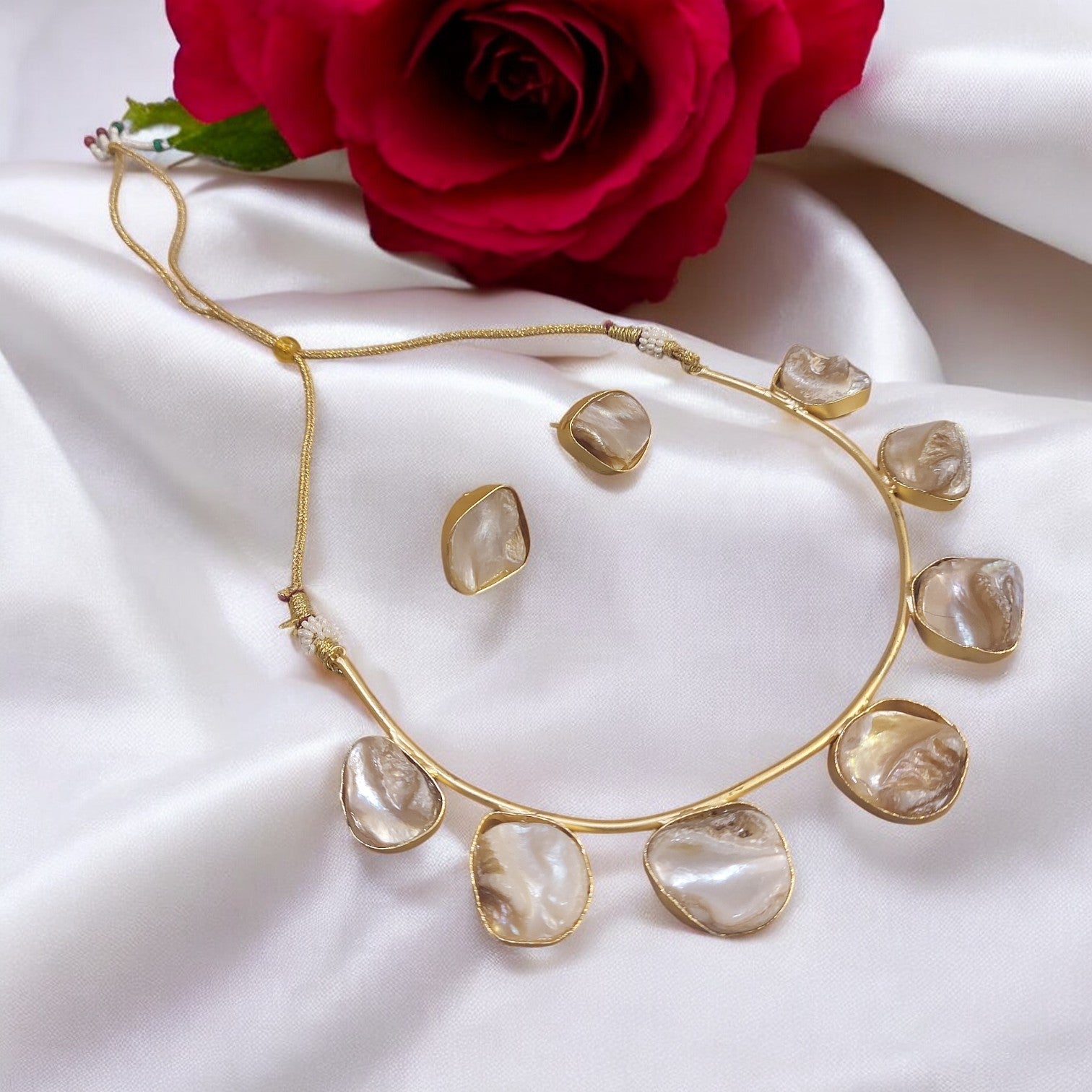 A gold-plated mother of pearl hasli necklace with matching earrings showcases a beautiful fusion of traditional and modern design. The...