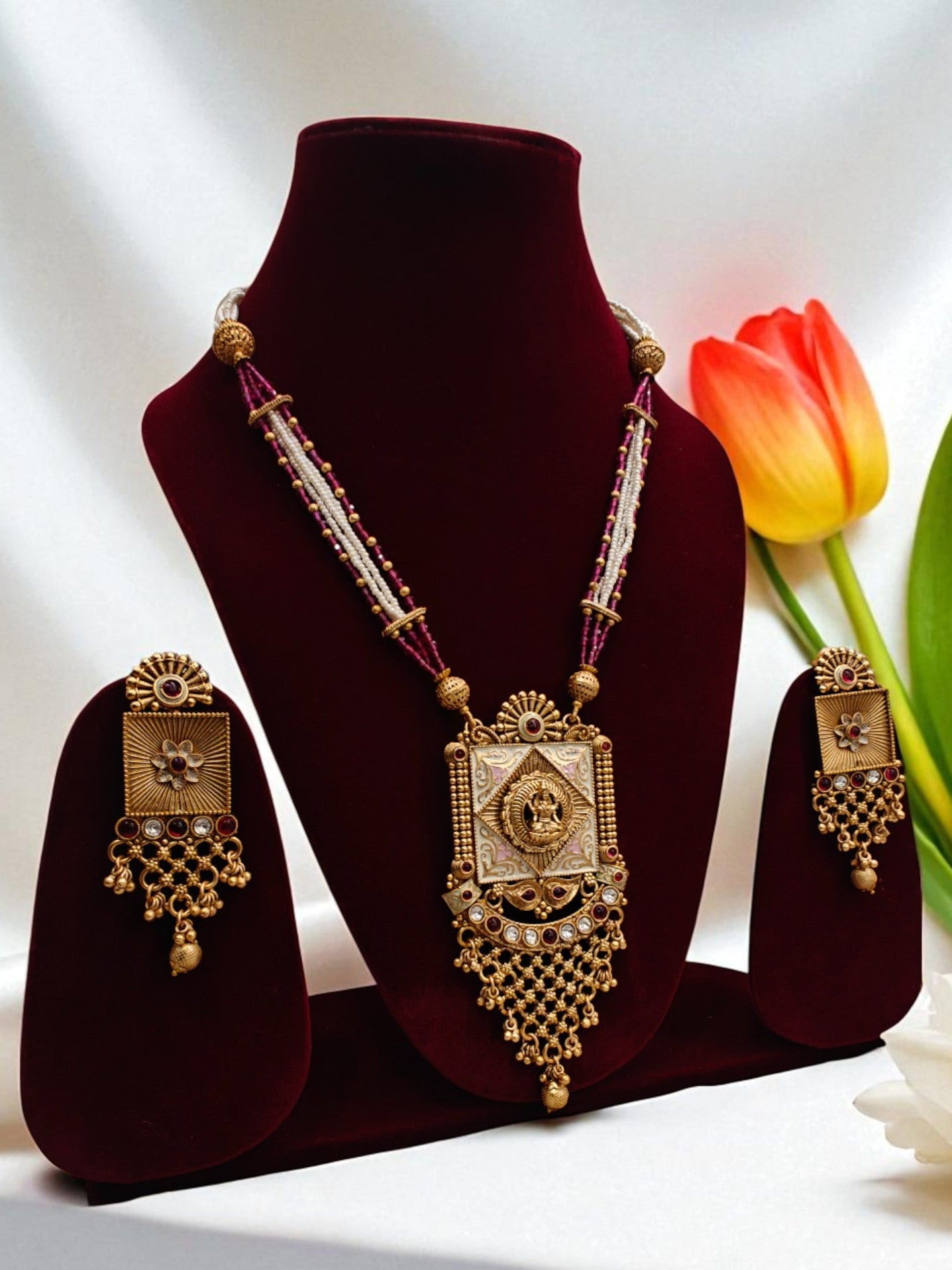The Padmini Rajwadi Long Necklace Set showcases exquisite craftsmanship inspired by traditional royal designs. This elegant set features intricate detailing...