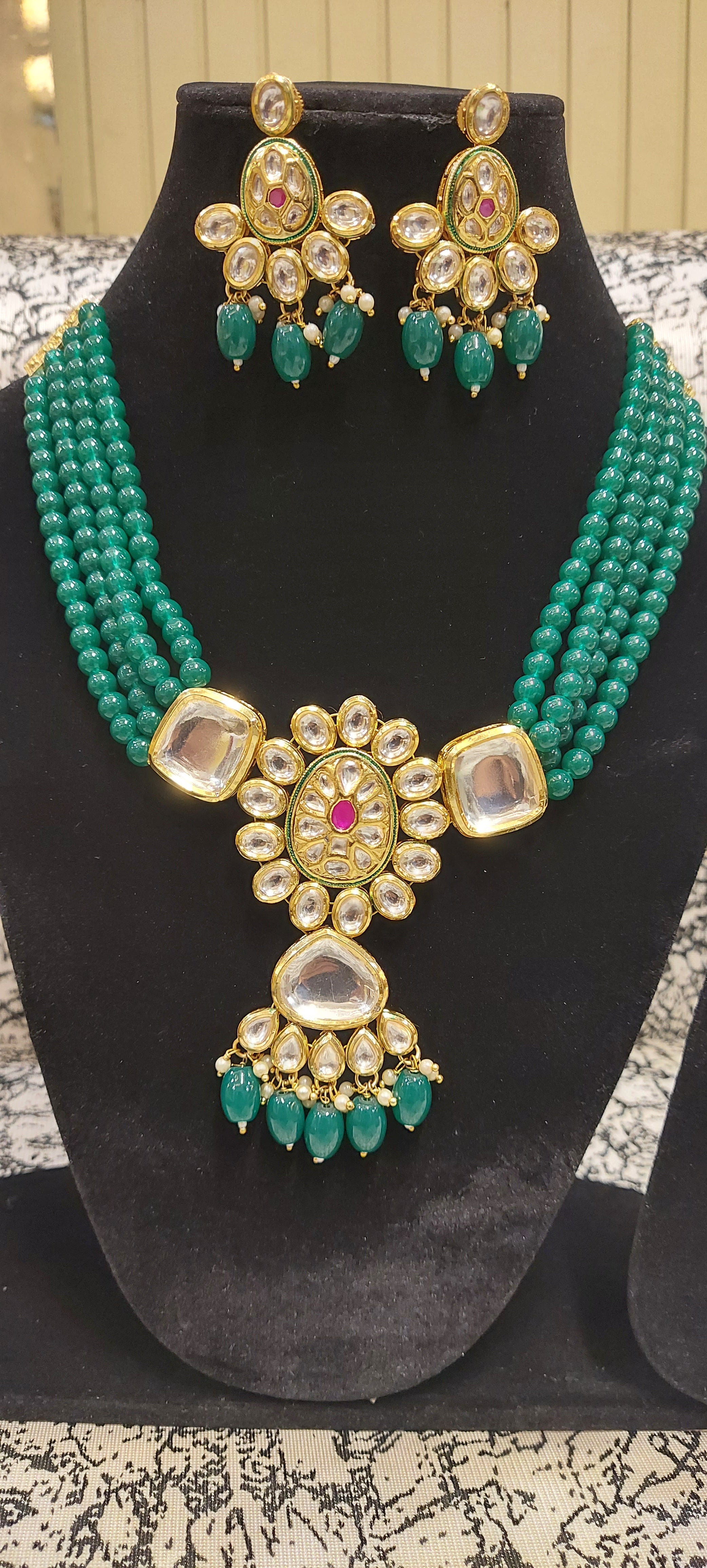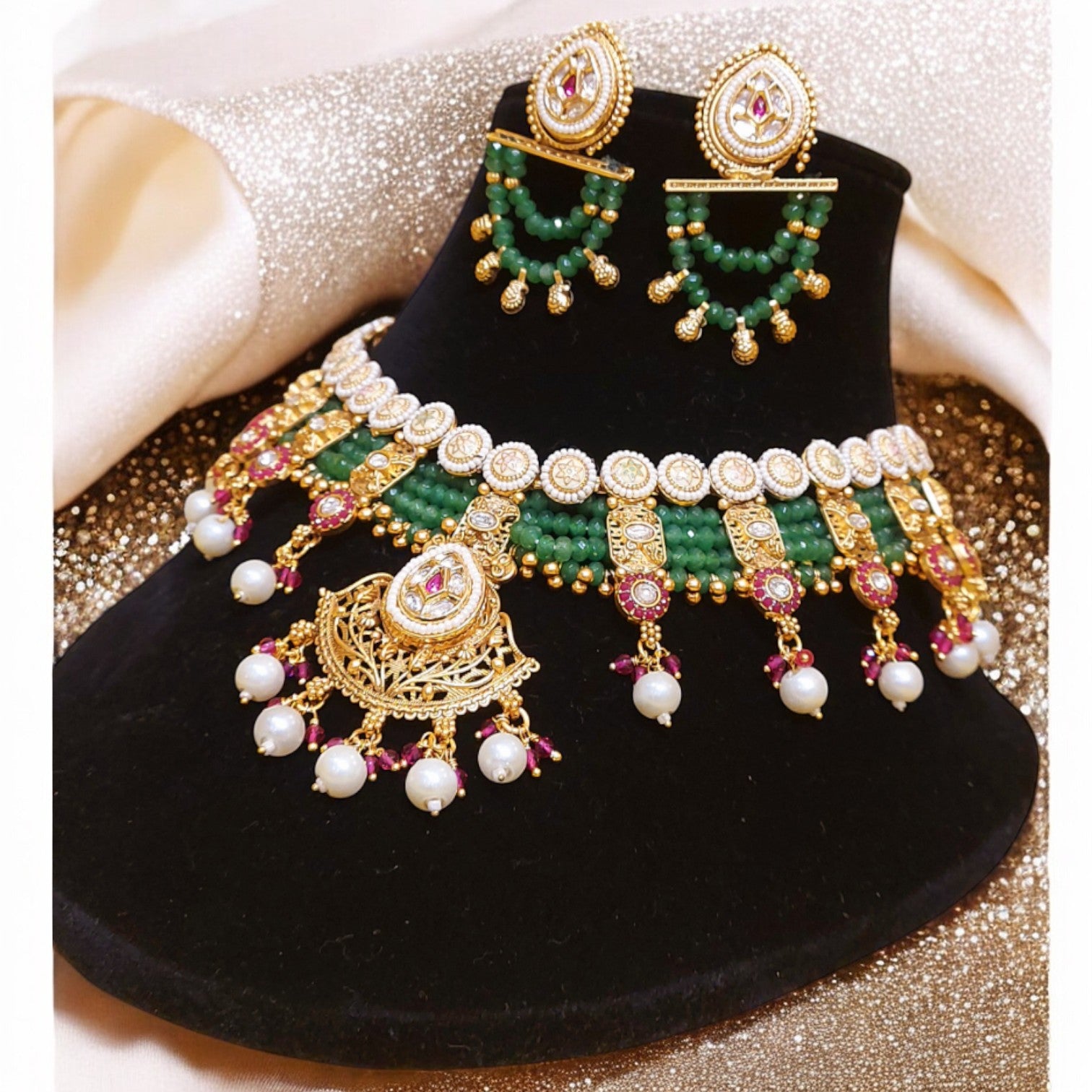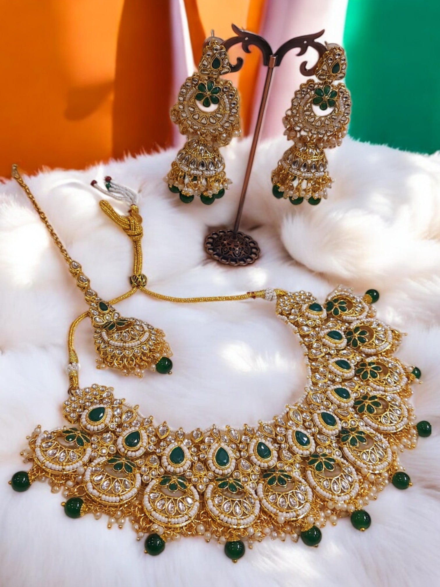 Elevate your bridal look with our stunning Green Kundan Bridal Choker Set. Crafted with intricate Kundan designs, this set exudes...