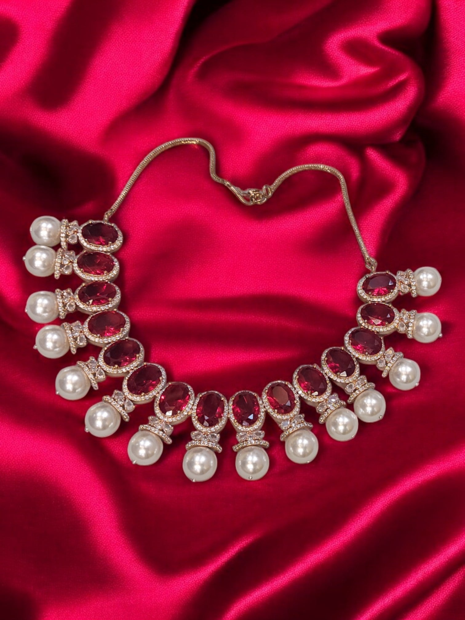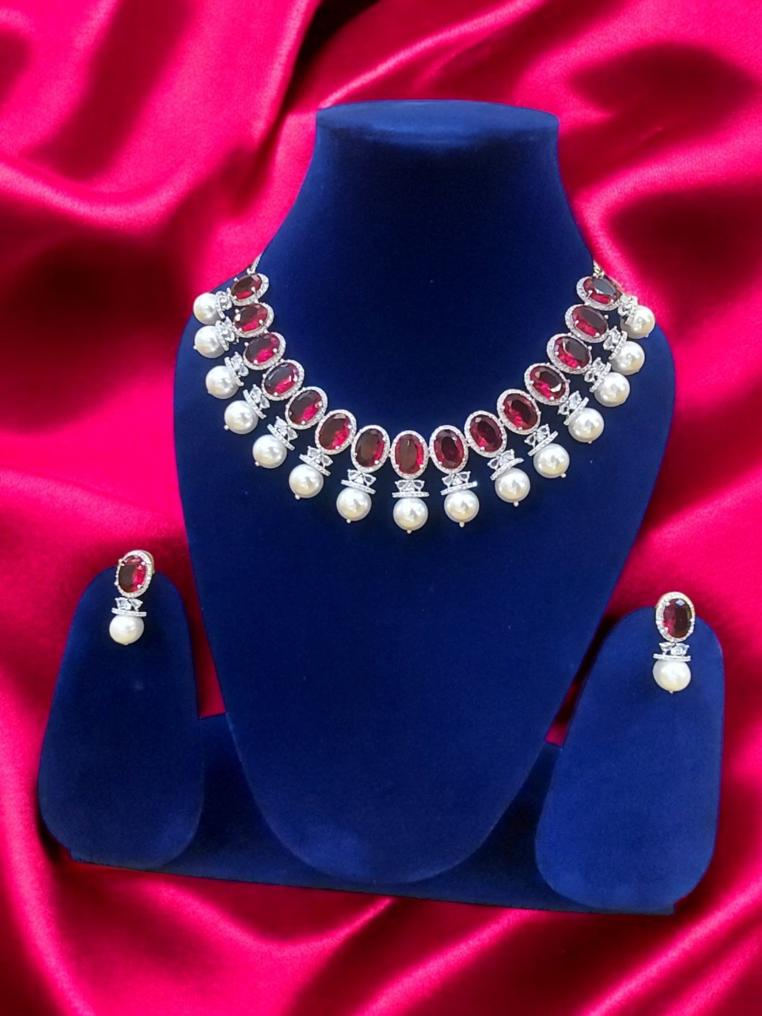 RUBY RED SILVER AMERICAN DIAMOND PEARL STUDDED NECKLACE