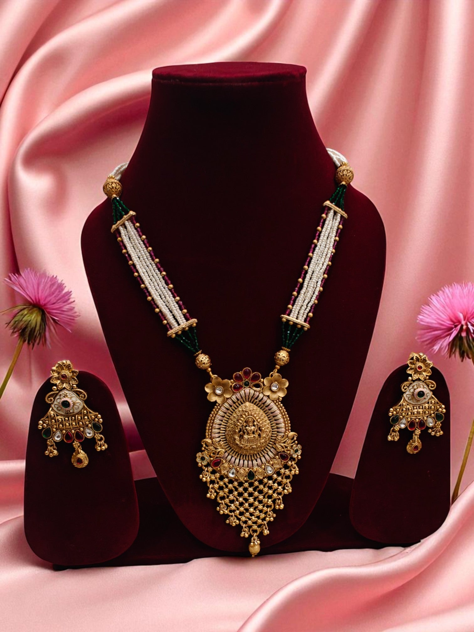 The Padmini Rajwadi Long Necklace Set showcases exquisite craftsmanship inspired by traditional royal designs. This elegant set features intricate detailing...
